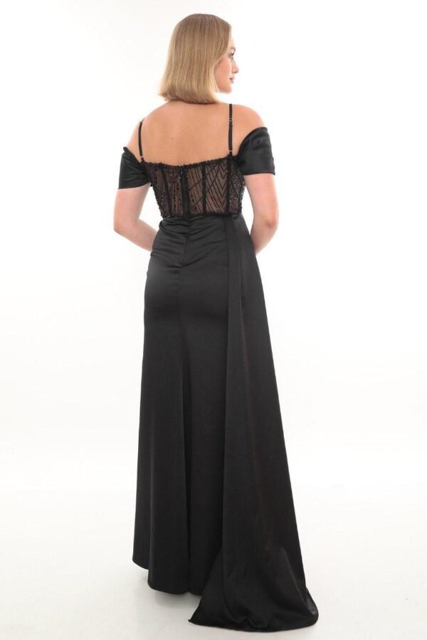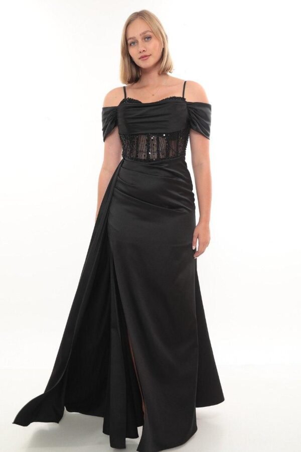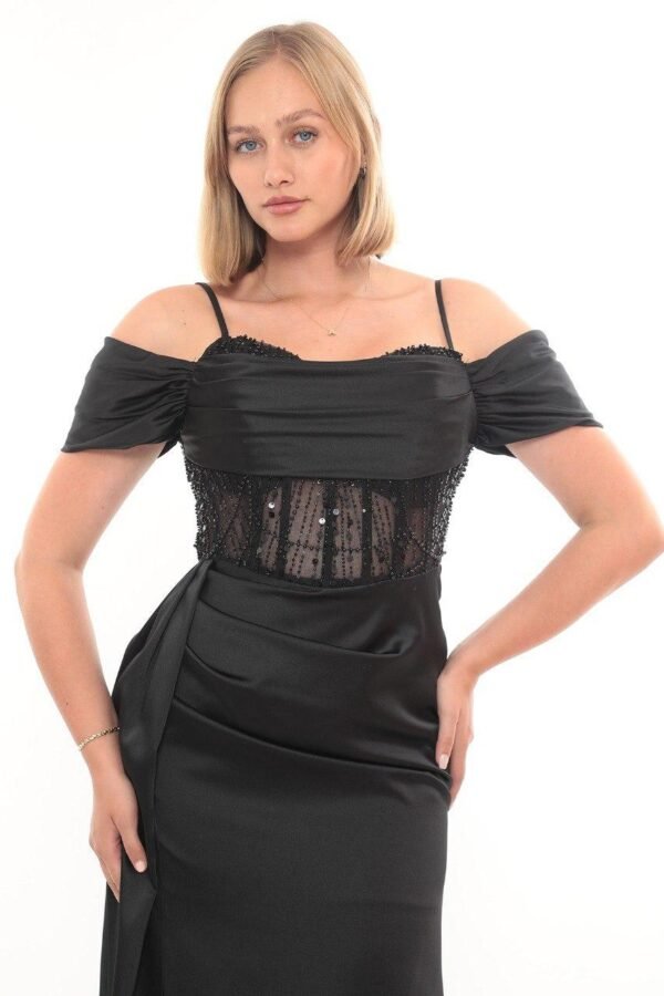 Saten kumaş, aller göğüs detayı ve degaje yaka tasarımıyla zarif bir görünüm sunan şık abiye modeli.